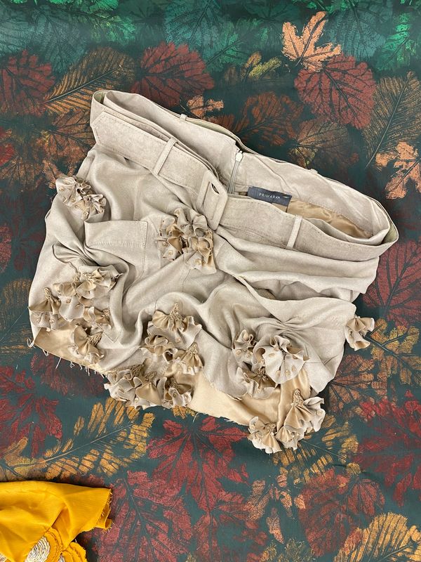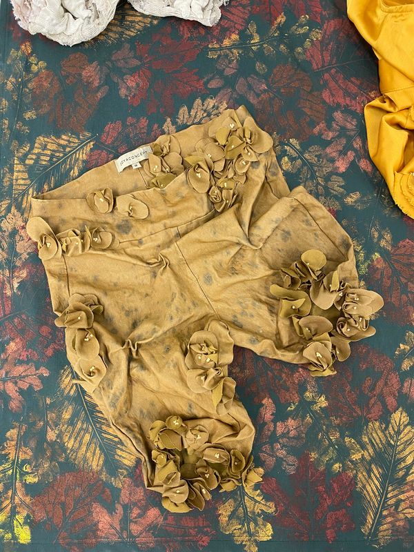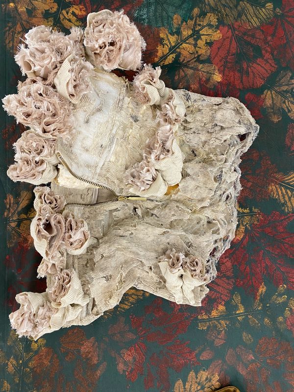 Synthetic textile from discarded fast fashion clothing, mycelial sculpture, deadstock fabric, fabric ink, cotton thread dyed with hawthorn